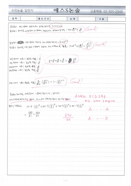 용산고 OO현 학생 수리논술 답안 및 첨삭
